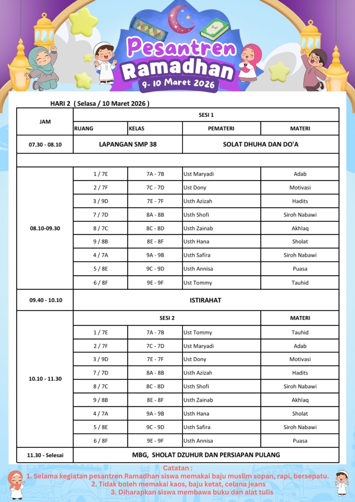 Semarang, 10 Maret 2026 – Bulan Ramadhan 2026 menjadi momen spesial bagi siswa-siswi SMP Negeri 38 Semarang. Sekolah ini sukses menyelenggarakan Pesantren Kilat Ramadhan selama dua hari (9-10 Maret 2026), dengan pengisian kegiatan yang semakin bermakna berkat kehadiran relawan dari Jamaah Ansharu Syariah (atau Ansharu Syariah). Kolaborasi ini membuat program pendidikan agama di sekolah negeri terasa lebih segar, interaktif, dan penuh semangat dakwah!