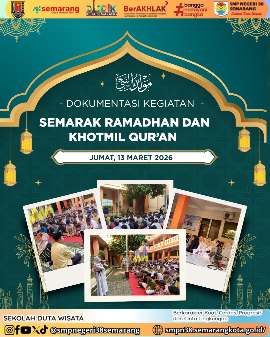 SMP Negeri 38 Semarang sukses menyelenggarakan puncak kegiatan Semarak Ramadhan dan Khotmil Qur'an pada Jumat, 13 Maret 2026. Acara ini menjadi penutup rangkaian Pesantren Kilat Ramadhan yang telah berlangsung selama dua hari sebelumnya, yaitu pada 9-10 Maret 2026.